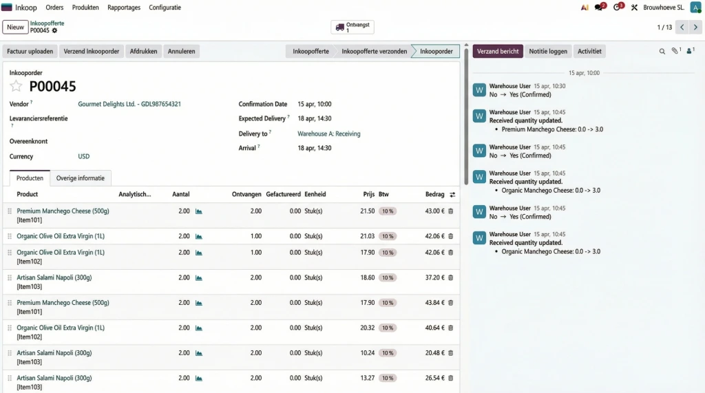 Nooit meer handmatig voorraden tellen. Stel minimale voorraadregels in: zodra een product onder de grens komt, maakt Odoo automatisch een concept-inkooporder aan bij de voorkeursleverancier.